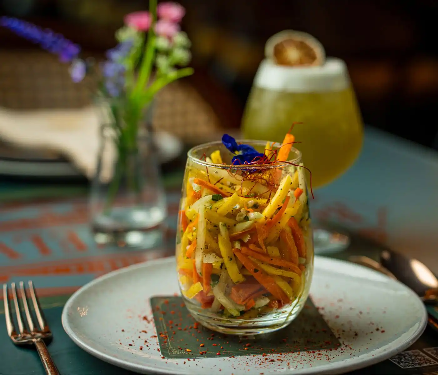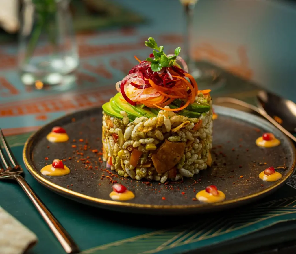 Mumbai-style crispy rice puffs paired with fresh corn, rich avocado, zesty tamarind and a refreshing mint emulsion create a delightful burst of flavour in every mouthful. This delightful chaat offers a fresh take on classic flavours, served only at Bombay Velvet in Reston, VA.