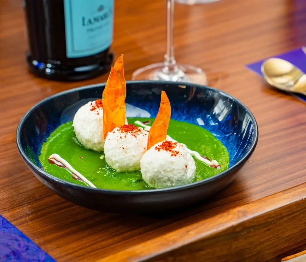 Originating from the heart of India, this dish features cottage cheese dumplings in a bed of fresh spinach, tomatoes, spices, and green herbs. It’s the perfect balance of rich flavors and fresh greens, available at Bombay Velvet in Reston, VA.